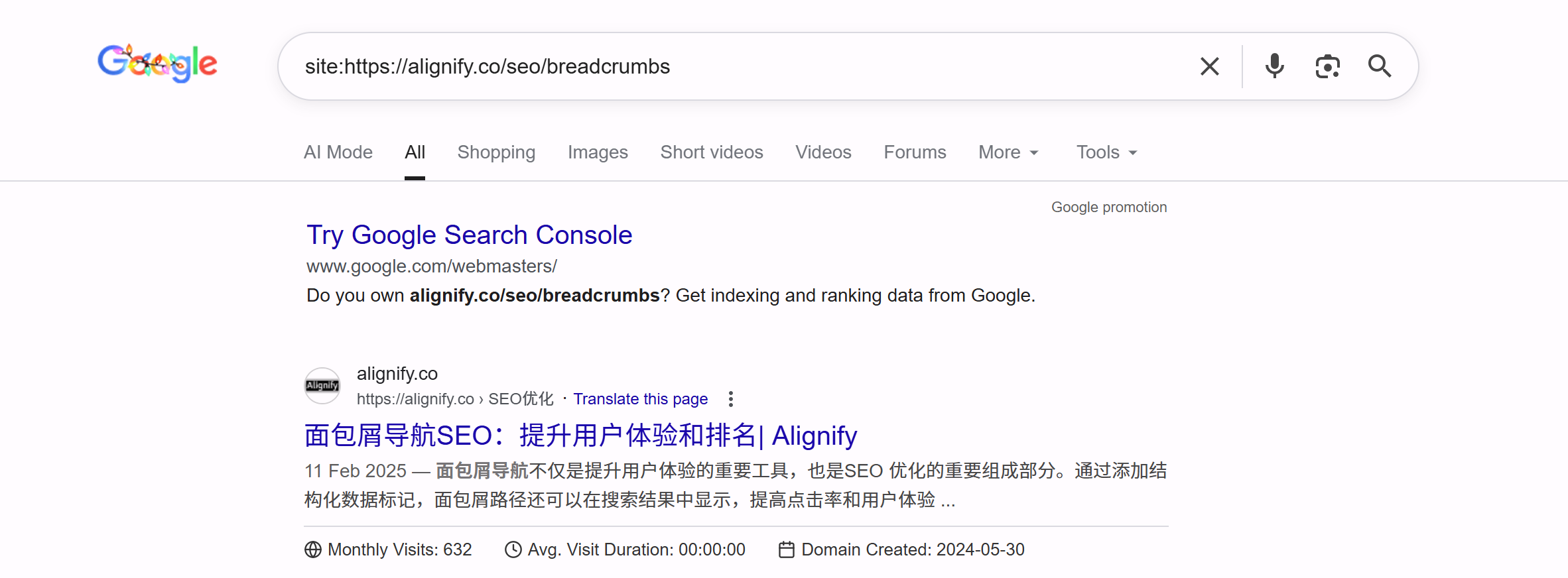 分析:这个 Meta Title 长度适中(约 32 个字符),关键词"面包屑导航"和"SEO"出现在标题前半部分,品牌名"Alignify"放在末尾,符合最佳实践。Meta Description 长度约 100 个字符,准确描述了页面内容,包含了关键词"面包屑导航"、"SEO"、"最佳实践"等,同时说明了页面提供的价值(实用指南、技术实现方法)。整体来说,这个配置很好地平衡了 SEO 需求和用户体验。